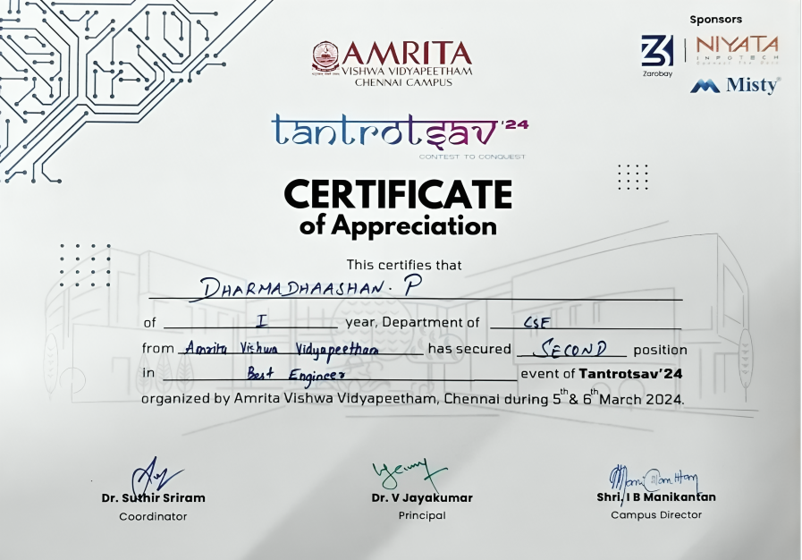 Hi, I'm Dharmadhaashan P, a tech enthusiast passionate about software engineering, machine learning, and building impactful projects. I enjoy solving complex problems, participating in hackathons, and continuously learning new technologies.
