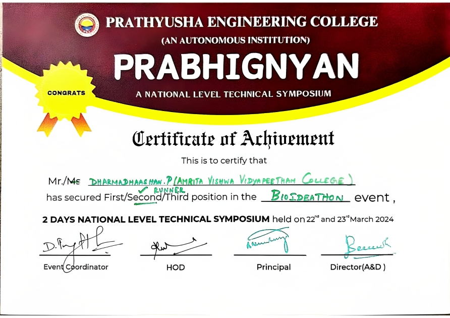 Awarded 2nd place in the Prabhignyan Bioideathon for developing an innovative Biotech solution among 30+ competing teams.